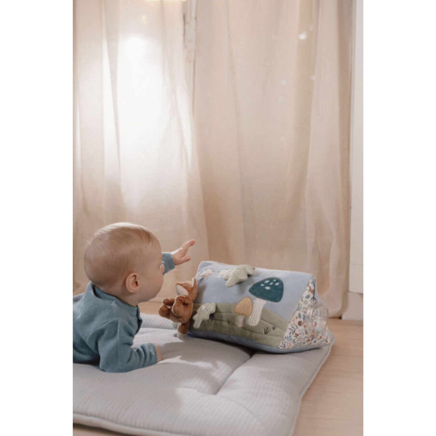 Leiskitės į nuotykius su miško draugais! Šis universalus ir linksmas veiklos trikampis leis jūsų mažyliui patirti nuotykių užburtame miške pilvuko miego metu. Pakeliui galima daug ką patyrinėti. Nuo spragsinčių atostogų iki mažo veidrodėlio, skirto savęs pažinimui. Žaismingų elementų ir smagių tekstūrų trikampis įtrauks jūsų kūdikio pojūčius ir vaizduotę.