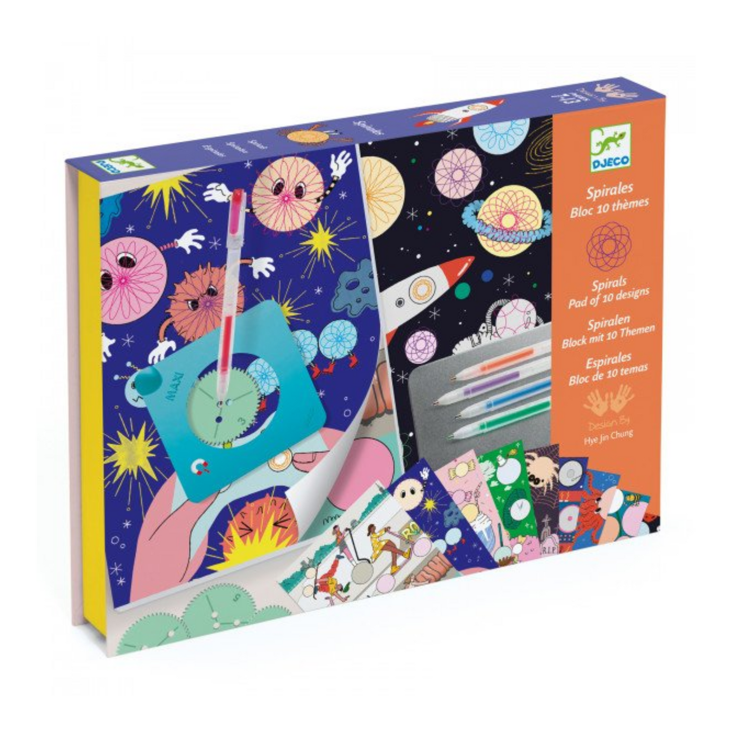 Rinkinį sudaro: 130 iliustruotų lapų bloknotas (21 x 28 cm), 1 metalinė lentelė (21 x 28 cm), 2 magnetiniai rėmeliai, 5 plastikiniai krumpliaračiai, 5 geliniai rašikliai, 1 plakatas, kuriame paaiškinta, kaip kurti spirales, 1 spalvota pavyzdžių knygelė.
