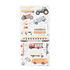 Rinkinį sudaro 15 iliustruotų magnetukų, vaizduojančių įvairias sausumos transporto priemones: motociklą, dviratį, sunkvežimį, automobilį ir kitas sausumoje naudojamas transporto priemones, ir 15 magnetinių etikečių, atitinkančių šias skirtingas transporto priemones anglų kalba.