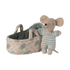 Mielas Maileg kūdikėlis peliukas su minkštu, dryžuotu megztu kostiumėliu.