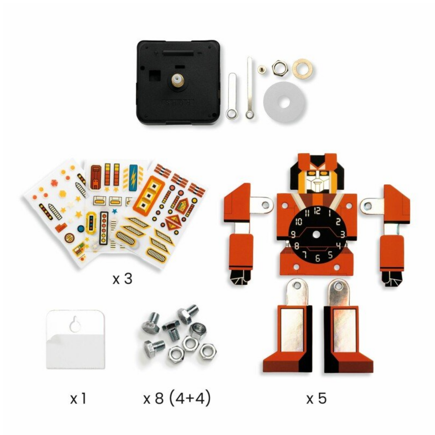A creative kit to make a clock that needs to be assembled and decorated with over 80 stickers and accessories.