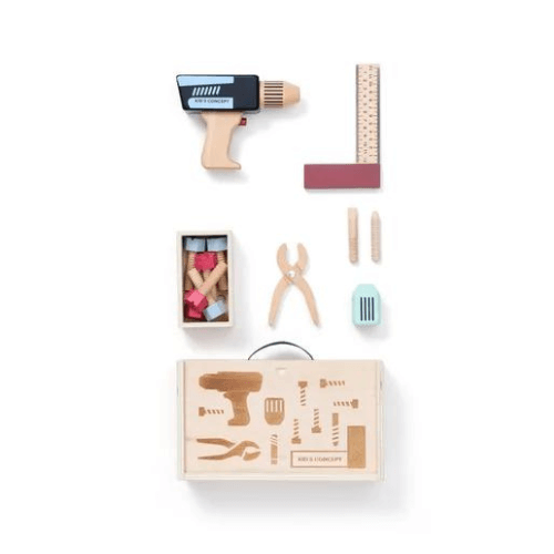 Here's a great kit for the little constructor at home. Made from FSC-certified wood, a tool case with dovetail joints and everything for kids who like to screw and fix things. A "click-click" is heard when turning the chuck. You can convert it from a drill to a screwdriver at any time by changing the bits. The set also includes toy screws that come in a wooden box with threads on the bottom where the screws can be attached. You can also use a manual screwdriver or pliers for the most difficult construction tasks. To keep things straight or if you need to measure something, of course there's a square that can get the job done.