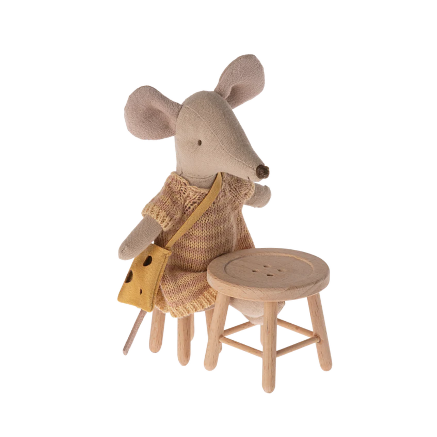 A stool and table set for the mouse family. Inspired by buttons, it can be combined with other mouse furniture and accessories to create a wonderful home. It fits perfectly with the mouse hole farm.