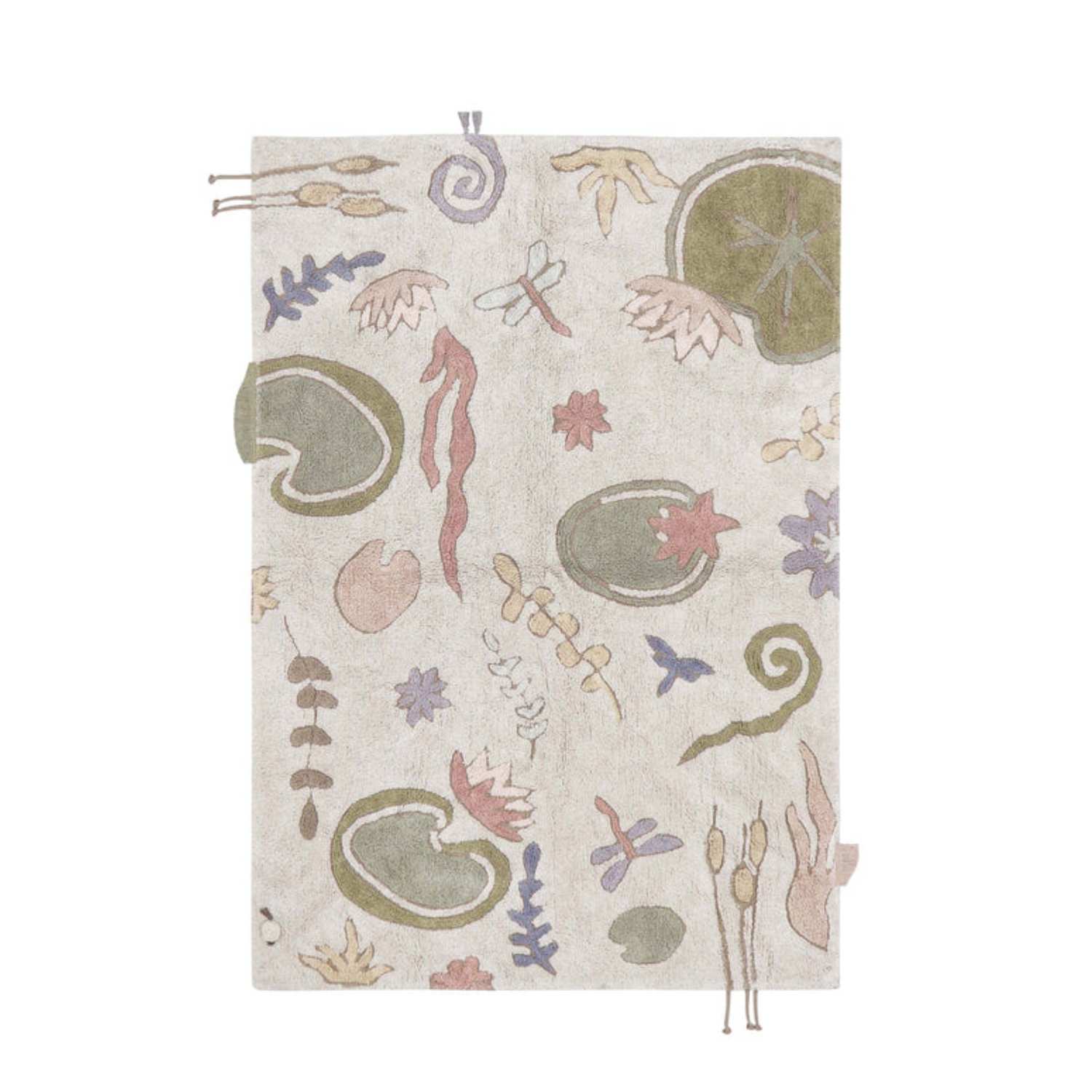 A magical world of blooms and bustle on the rug! With this pastel-colored washable cotton rug, little ones can enter a botanical fantasy world with a piece of nature, including a pet frog and snail! Fred the frog and Lazy the snail will keep them company as they play. This is the ideal rug for a children's room decor with a touch of botanical fantasy.